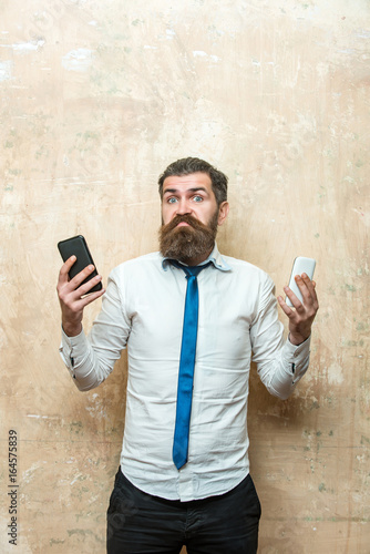 hipster, bearded, man, businessman, mobile, phone, long, beard, stylish, hair, surprised, face, compare, smartphone, attaching, white, shirt, beige, background, unshaved, moustache, haircut, fashion, fashionable, emotion, office, manager, business, guy, information, 3g, mobile phone, mobile phone, web, mobile internet, blog, web log, social network, mobile device