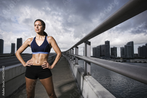 Hispanic woman in sportswear standing near urban waterfront