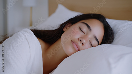 Hispanic woman sleeping comfortably on white bed in luxury hotel