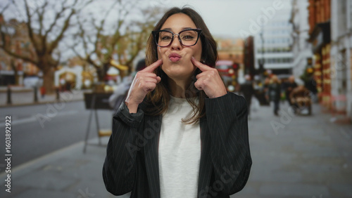 Hispanic woman smiling outdoors on a city street in london, wearing glasses and a casual white shirt, surrounded by urban traffic and people.