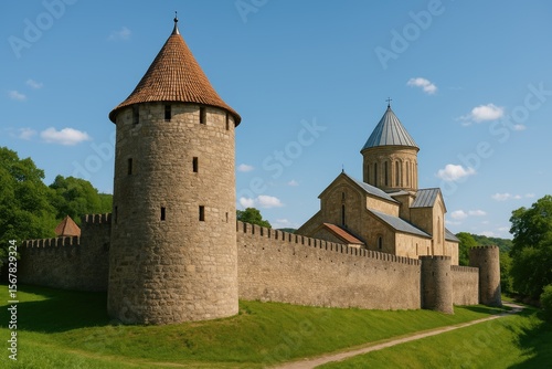 Historic 12th-century castle and fortress with ancient religious structures in a medieval city setting for summer travel and tourism