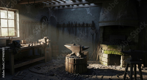 Historic blacksmith's workshop with a prominent anvil, old tools on a workbench, and sunlight creating an atmospheric scene of traditional metalworking and craft