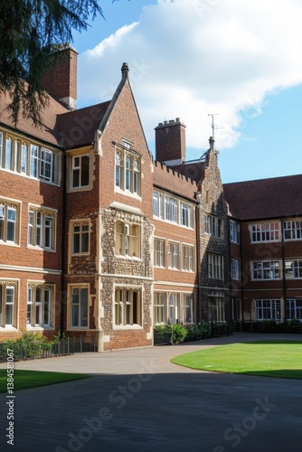 historic, building, brick, architecture, academic, campus, sunny, day, greenery, architectural, detail, exterior, design, classic, style, serene, environment, educational, institution, landscaping, traditional, setting, school, ground, student, space, area, university, historical, site, peaceful, atmosphere, nature, urban, landscape, daylight, beauty, life, weather, beautiful, heritage, manicured, lawn, inviting, charming, surrounding, colours, tranquil