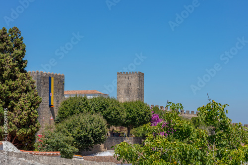 castle, fortress, mediaeval, historic, portugal, obidos, village, architecture, travel, tour tourism, heritage, traditional, wall, stone, church, tower, rooftop, tiled, town, old, building, european, summer, scenic, view, landscape, ancient, culture, blue, sunny, picturesque, urban, attraction, outdoors, day, sky, quaint, charming, sightseeing, structure, history, background, touristic, cultural, tree, garden, flag, floral, rustic