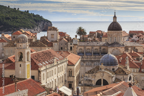historic, old, town, cathedral, st, church, clock, tower, palace, dubrovnik, croatia, colours, colours, outdoors, outside, day, nobody, no one, baroque style, mediaeval, history, historical, heritage, clock-tower, unesco, croat, european, building exterior, architecture, architectural, religious building, famous, urban scene, urban, city landscape, rooftop, cloudscape, coastal, coast, sea, water