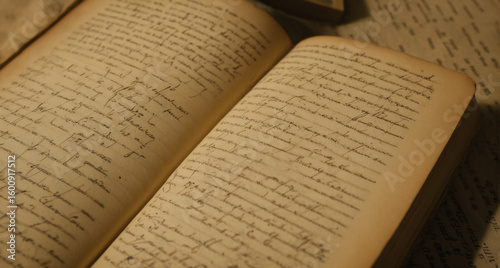 book, vintage, manuscript, handwritten, cursive, text, page, yellowed, aged, historical, archival, faded, ink, script, writing, document, detailed, narrative, old, paper, warm, soft, lighting, shadow, texture, literature
