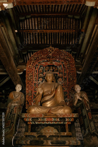 Historical Chinese temple featuring intricate sculptures and a prominent Buddha idol