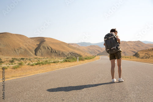 Hitchhiker traveler woman on the road in sunset. Girl traveler hiker on the road. Summer vacation. Freedom.