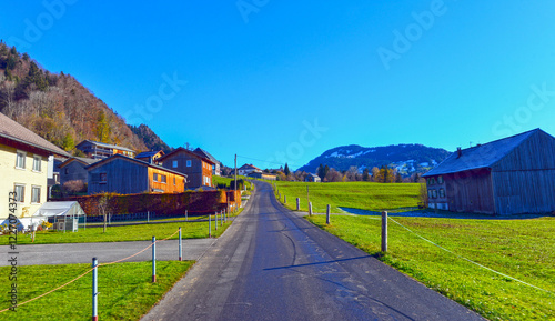 vorarlberg, austria, panorama, autumn, heaven, blue, meadow, street, way, farmhouse, farm, village, forest, green, meadow, vacation, scenic, idylli, horizon, bungalow, traditional, architecture, peak, alpen