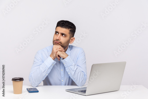 Hmm, need to think! Pensive thoughtful businessman sitting office workplace with laptop on desk, pondering business plan, having doubts, not sure. indoor studio shot isolated on white background