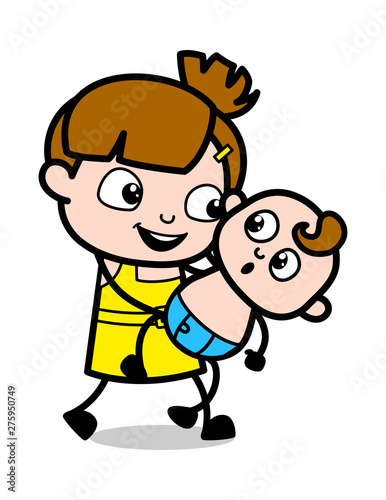 Holding a Baby and Playing - Cute Girl Cartoon Character Vector Illustration