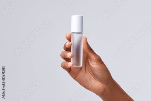 Holding a clear cylindrical container with a white cap in a neutral setting highlighting simplicity and beauty product presentation