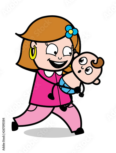 Holding Baby in Hands and Playing - Retro Cartoon Female Housewife Mom Vector Illustration