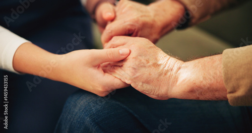 Holding hands, therapy and caregiver with senior patient for consulting in closeup, nursing home or retirement. Wellness, healthcare and touching elderly person for compassion, empathy or medic help