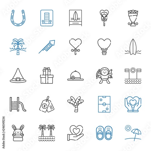holiday, icon, set, vector, beach, sandal, nubes, palm, tree, rabbit, air, hockey, price, tags, slide, cupid, pamela, gift, sorcerer, hat, surfboard, hot, balloon, lollipop, fireworks, bouquet, hotel, horseshoe, illustration, symbol, signs, design, isolated, background, flat, silhouette, line, element, graphic, logotype, white, vacation