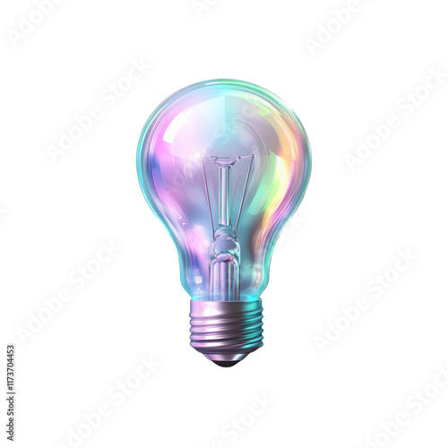 Holographic 3D light bulb icon design with a glowing iridescent effect, showcasing a modern and futuristic look. Isolated on transparent background, png.