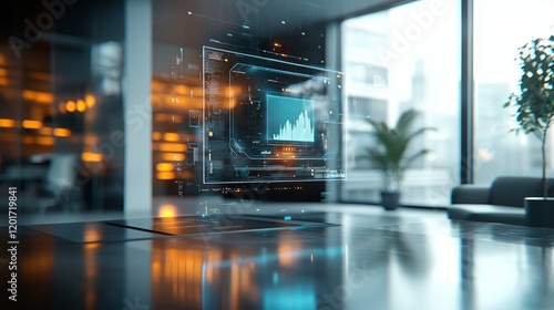 Holographic AI interface floating above a modern office desk, showcasing futuristic data visualization in a sleek corporate environment.