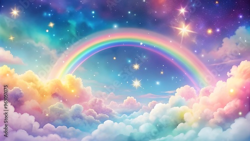 Holographic fantasy rainbow background with clouds and stars. Pastel color sky.Cloudy sky background. Unicorn fantasy pastel galaxy. Rainbow cute wallpaper. Fluffy magic pink landscape