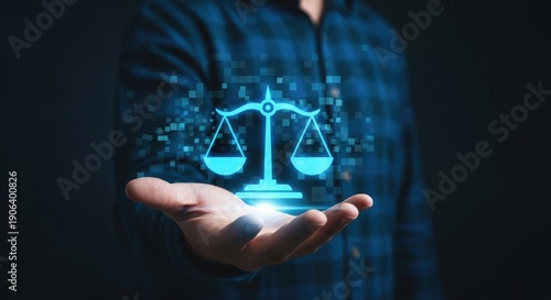 futuristic, balance, law, justice, technology, innovation, virtual, digital, three-dimensional, projection, interactive, hologram, glowing, blue, hand, person, dark background, mystery, futurism, conceptual, symbolic, representation, equality, fairness, precision, advanced, cutting edge