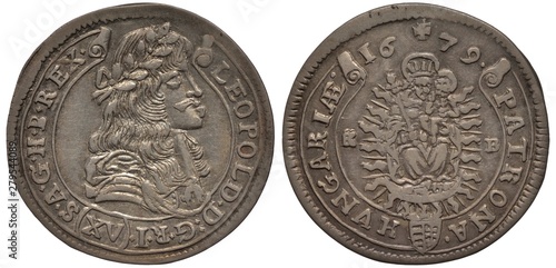 Holy Roman Empire of German Nation silver coin 15 fifteen kreutzer 1679, bust of Emperor Leopold right, Madonna with child on radiant background, date above,