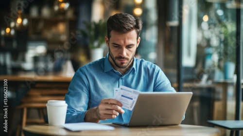 man, working, laptop, card, organisation, hand, table, inspiration, eye, shirt, productivity, communication, project, information, computer, planning, interaction, management, analysis, office, evaluation, business, work, task, arm, young, face, resource, service, indoor, professional, blue, money, entrepreneur, connection, motivation, technology, document, shiny, success, environment, coffee, client, dynamic