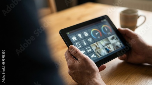 tablet, hand, home, automation, control, dashboard, smart, device, monitor, user, security, temperature, surveillance, interface, wireless, energy, remote, screen, touch screen, cyberspace, connectivity, network, sensor, management, technology, system, modern, efficiency, digital, intelligent, house, equipment, app, application, display, setting, wi-fi, monitoring, environment, lifestyle, household, indoor, wood, light, colours, composition