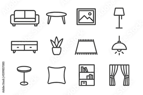home, decor, icon, furniture, accessory, sofa, table, lamp, frame, plant, rug, light, racked, cushion, bookshelf, curtain, interior, design, minimal, set, illustration, black, white, modern, style, elegant, line, art, symbol, graphic, abstract