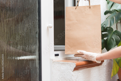 delivering, quarantine, glove, bag, door, deliver, delivery, disinfectant, food, hand, hygiene, hygienic, infection, order, package, prevention, protection, purchase, safety, service, shopping, shopping bag, supermarket, take-away