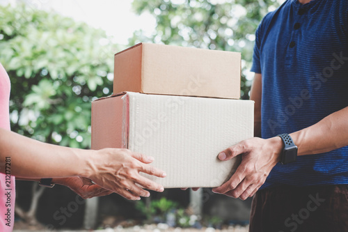 Home delivery service and working service mind, Woman customer hand receiving a cardboard boxes parcel from delivery service courier