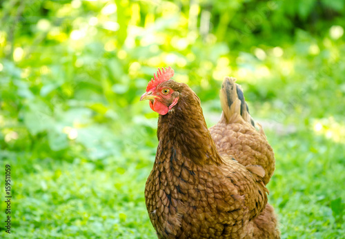Home grown domestic chicken in a fresh green garden with warm bright spring light
