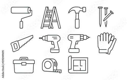 home, improvement, tool, equipment, linear, icon, construction, hammer, saw, drill, roller, ladder, nail, glove, toolbox, tape, blueprint, renovation, bricolage, project, work, handyman, repair, build, house, interior, exterior, design, decor, renovate, manual, labor, fix, maintain, model, craftsman, woodwork, structure, measure, safety, professional, resource, kit, utility, implement, functional, assembly, precision