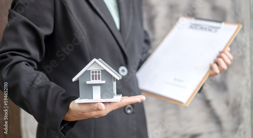 Home insurance concept and real estate. Businesswoman holding a house model working in investment about renting a house, buying a house, and home insurance