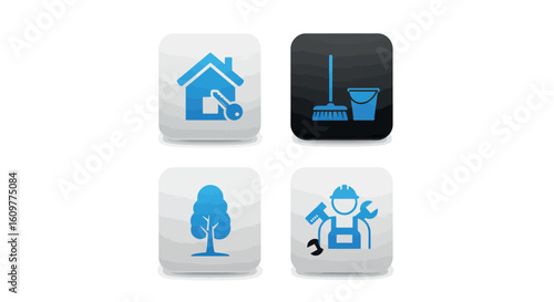 flat, icon, home, maintenance, repair, cleaning, gardening, construction, tool, service, house, broom, paint, bucket, wrench, tree, men at work, app, symbol, design, tool, brush, spanner, professional, builder, silhouette, modern, simple, technology, blue, black, white, shadow, graphic, interface, digital, square, buttons