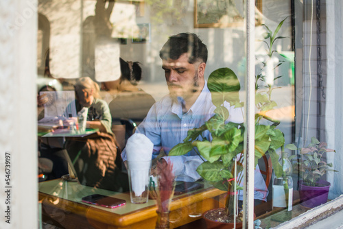 business, cafes, hot drink, cafes, computer, daytime, home office, indoor, laptop, latino, lifestyle, people, shirt, sitting, small business, street, table, technology, window, working