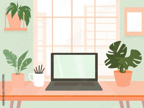 Home office illustration with laptop and plants on desk in front of window minimalist style indoor setting