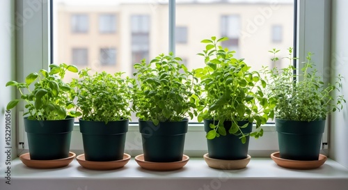 window sill, city, apartment, home, fresh, organic, cooking, ingredient, kitchen, green, nature, plant, healthy, living, urban living, culinary, aromatic, fragrant, natural light, light, bright, cosy, comfortable, decoration, interior, design, lifestyle, basil, mint, rosemary, thyme, simple, efficient, sustainable, homegrown, natural, health food, healthy lifestyle, convenient, sunlight