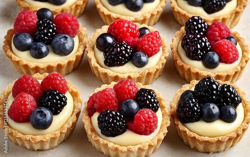 Homemade berry tartlets with creamy vanilla custard and fresh raspberries blueberries and blackberries in crispy golden buttery pastry shells for a decadent dessert