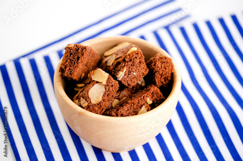 Homemade brownies chocolate with nut on wood plate on minimal style background