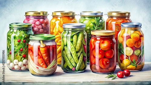 Homemade Canned Vegetables Watercolor Jars - AI Photography