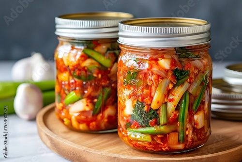 kimchi, korean food, vegetable, health food, homemade, preservation, garlic, chili, ginger, cabbage, radish, scallion, healthy eating, culinary, cookery, traditional, culture, fermentation, preserving, food photography, still life, closeup, vibrant, colourful, red, green, white, side dish, condiment, vegan, vegetarian, healthy lifestyle, asian cuisine