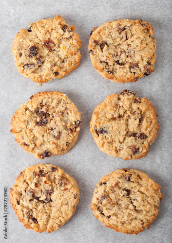 Homemade organic oatmeal cookies with raisins in baking tray on tracing paper background. Top view