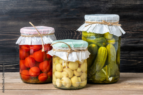 Homemade pickled cherry tomatoes, cucumbers, champignons, garlic, eggplant, red peppers in jars on wooden shelf Homemade canned and fermented foods concept Seasonal product