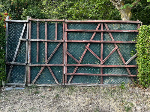 Homemade wood gate. Large closed gate with wooden planks frame. Geometry, architecture, and poorly built constructions.