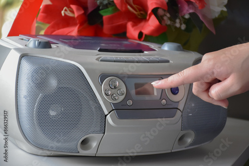Homeowner is inserting cd and pushing it into the cd deck back into place with his fingers to play music from his favorite cd player unit, vintage concept, soft and selective focus.