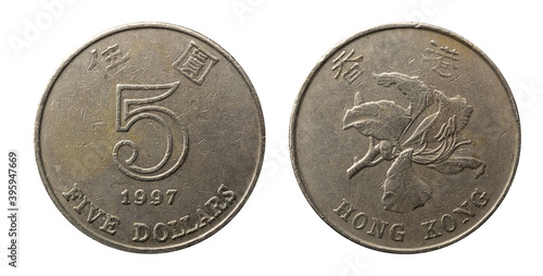 Hong Kong 5 dollars coin from 1997, obverse and reverse.