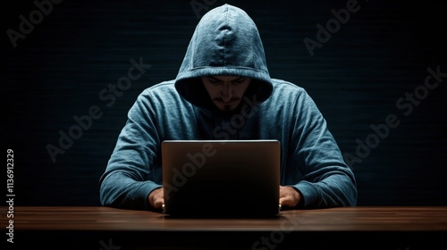 Hooded man sitting at a table working on a laptop. Cybersecurity, hacking, and technology concept.