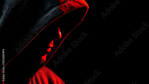 Hooded Portrait with Strong Red and Blue Contrast Lighting