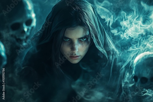 Hooded woman, intense gaze, skulls, smoky backdrop.