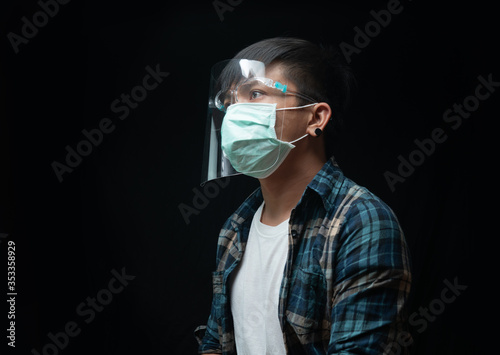 Hopeful man wear a face shield and mask for outbreak Coronavirus or Covid-19, New normal concept