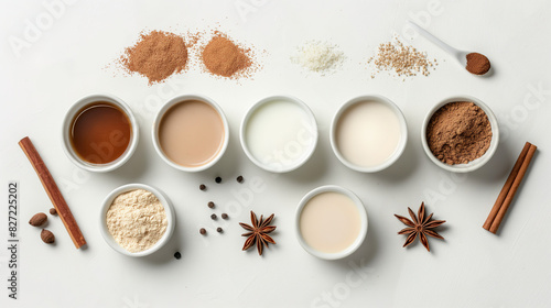 horchata Milk tea ingredients on a white background, including milk powder, cinnamon, star anise and other elements for making the drink.